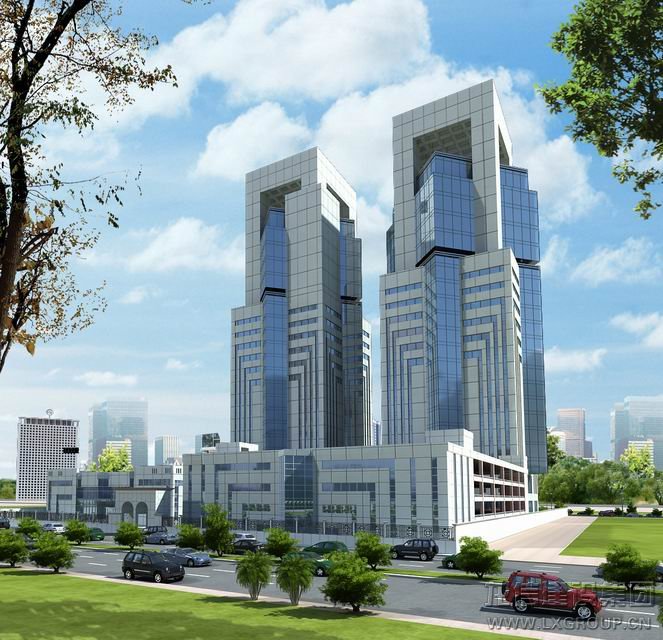 ,該建筑由兩棟完全一樣的22層大樓形成對稱美