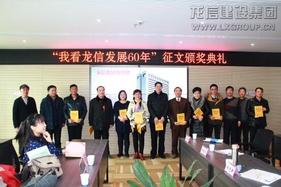 1月13日,由龍信集團主辦、海門日報社承辦的“我看龍信發(fā)展60年”征文頒獎活動在龍信大廈五樓會議室隆重舉行,龍信集團董事長陳祖新、總經(jīng)理唐愛東、副總經(jīng)理何咸軍、辦公室主任蔡颯爽,海門市委宣傳部副部長、海門日報社社長沈建生、總編范軍等參加了本次活動。本次活動是龍信集團60周年慶典系列活動之一,得到了海門各界人士的踴躍參與,共收到來稿200多篇,參與人數(shù)超百人。