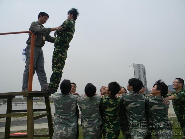 在做“高臺(tái)背摔”拓展訓(xùn)練時(shí),隊(duì)員們協(xié)同配合,親密無間,增進(jìn)了對團(tuán)隊(duì)的信任。