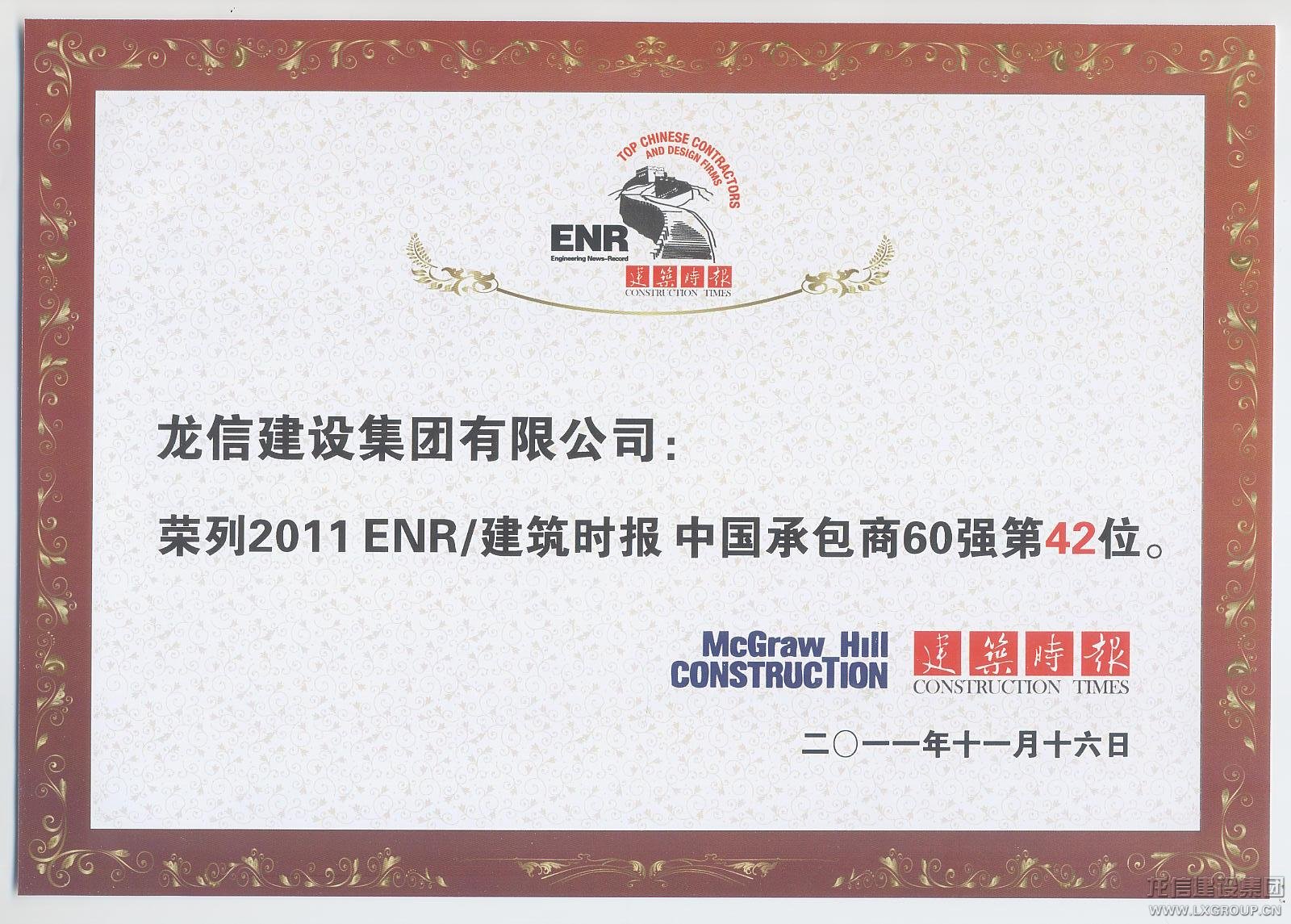 2011年ENR/建筑時報“中國承包商和工程設(shè)計企業(yè)雙60強”在滬揭曉。60家承包商及60家工程設(shè)計企業(yè)入選2011年中國工程界的“最強陣容”,龍信集團連續(xù)三年榮登“ENR中國承包商企業(yè)60強”,并以比去年提升11名的成績榮登最具成長性企業(yè)。